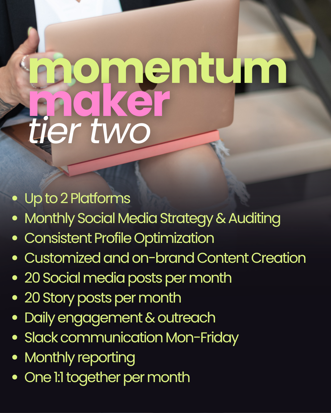 Momentum Maker is built for brands ready to grow beyond consistency and into connection. This tier layers strategy with execution, pairing intentional content creation with daily engagement and outreach to help your brand build stronger relationships and expand its reach. If you’re looking to increase visibility, engagement, and brand recognition while maintaining a steady rhythm across your platforms, Momentum Maker is designed to keep things moving — and compounding.
