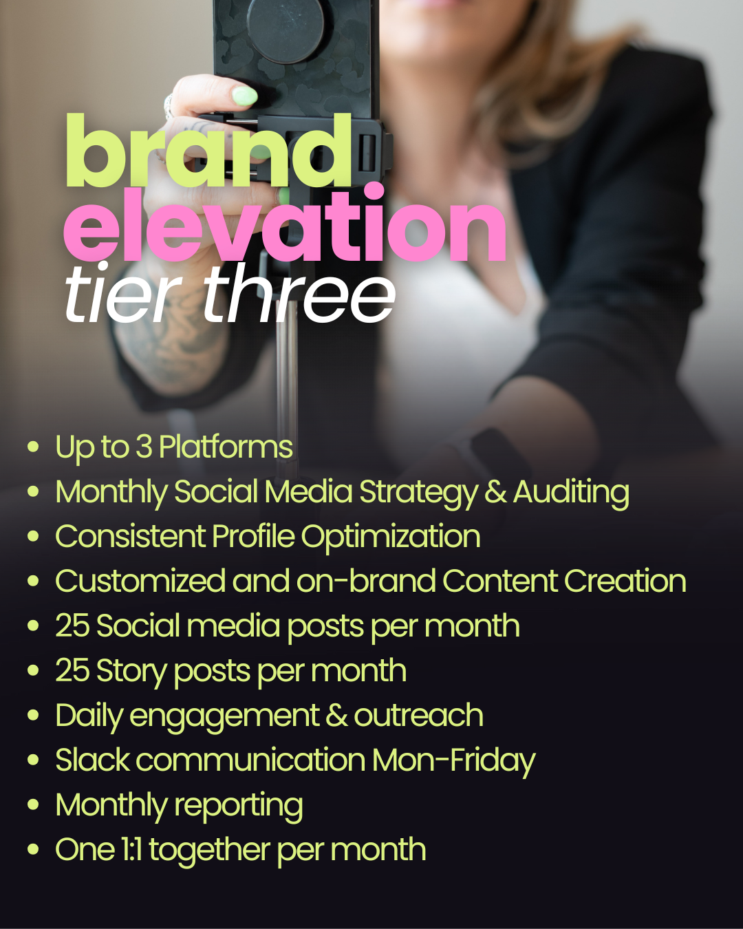 Brand Elevation is a high-touch, full-scale approach for businesses ready to lead with authority. This package supports a multi-platform presence with elevated content, deeper engagement, and hands-on strategy designed to position your brand as a trusted voice in its space. With expanded output, daily engagement, and refined storytelling, Brand Elevation focuses on long-term growth, stronger brand perception, and a social presence that supports real business goals — not just posting for the sake of posting.